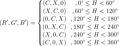 X = C × (1 - | ( H / 60 °) mod 2 - 1 |